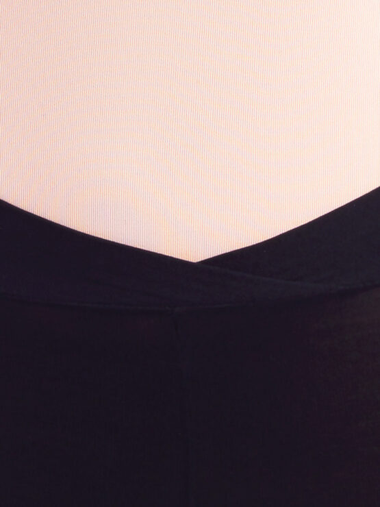 Crossover soft-knit waistband dips below the belly button and flatters the hips.